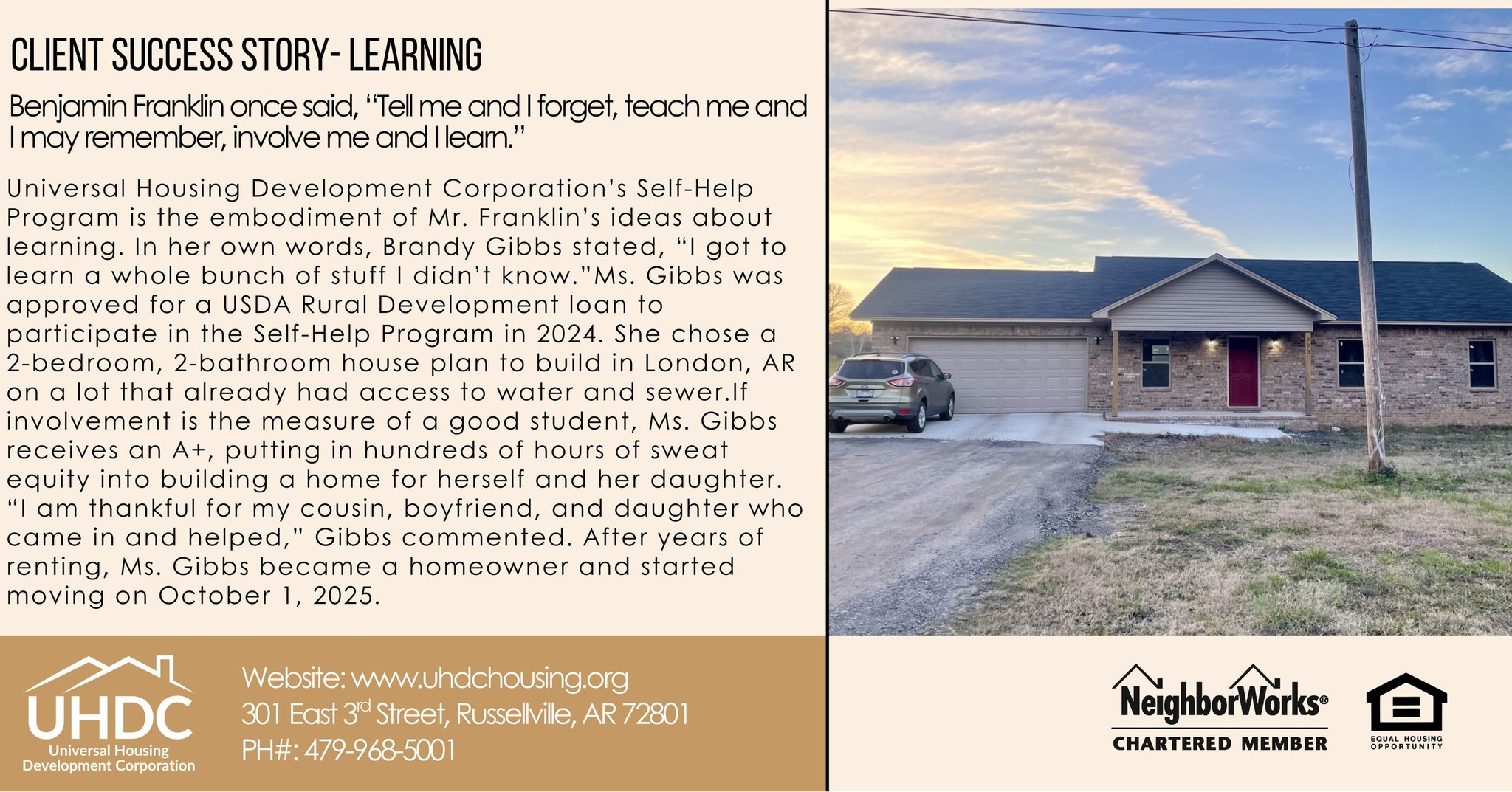 UHDC is a non-profit corporation that has been providing high quality, housing-related services since 1971. We are a HUD-approved Housing Counseling agency and a chartered member of NeighborWorks® America. Helping People, Building Dreams is our motto and if you live in Conway, Johnson, Franklin, Logan, Perry, Polk, Pope, Scott, or Yell County, Arkansas, you live in our neighborhood. Let’s work together so that everyone has a great place to live.